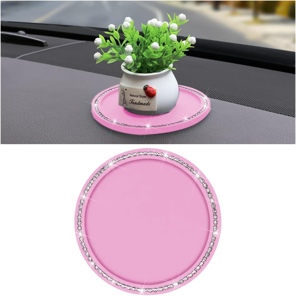 - 【Anti-Slip】: This product is designed with rhinestone wrapped edges and comes with anti-slip properties, which helps to stabilize the items. You can put your cell phone, perfume, cigarettes, pens, coins, glasses, etc. When you are on a bumpy road and brake suddenly, you don’t have to worry about what you put on the mat at all because it is non-slip enough.