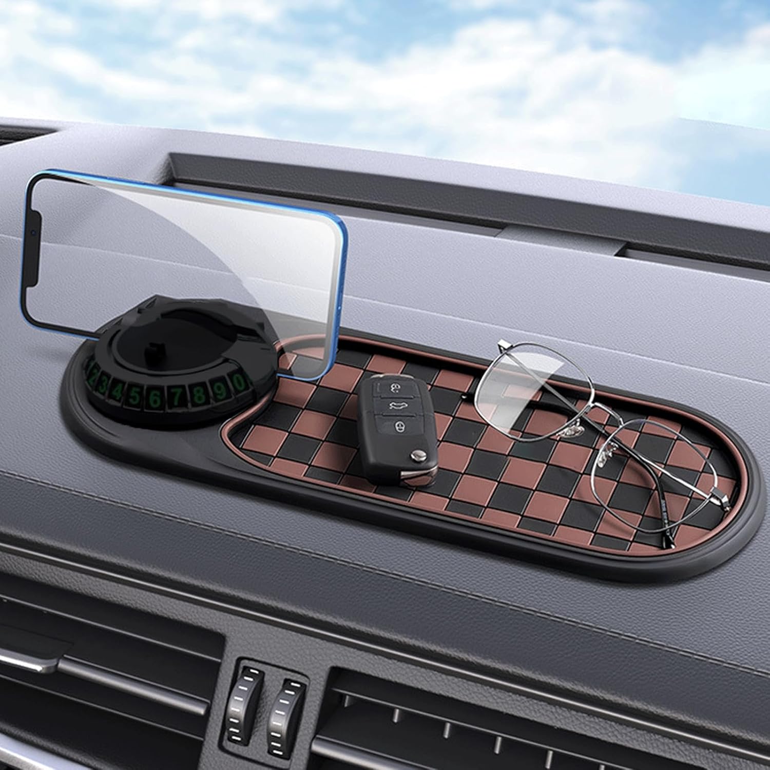 Multifunction Car Anti-Slip Mat Auto Phone Holder, 2025 New Rotatable Anti Skid Car Dashboard Pad with Temporary Parking Numbe and Extra Large Pad for Phones, Keys, Gadgets (Brown Black)