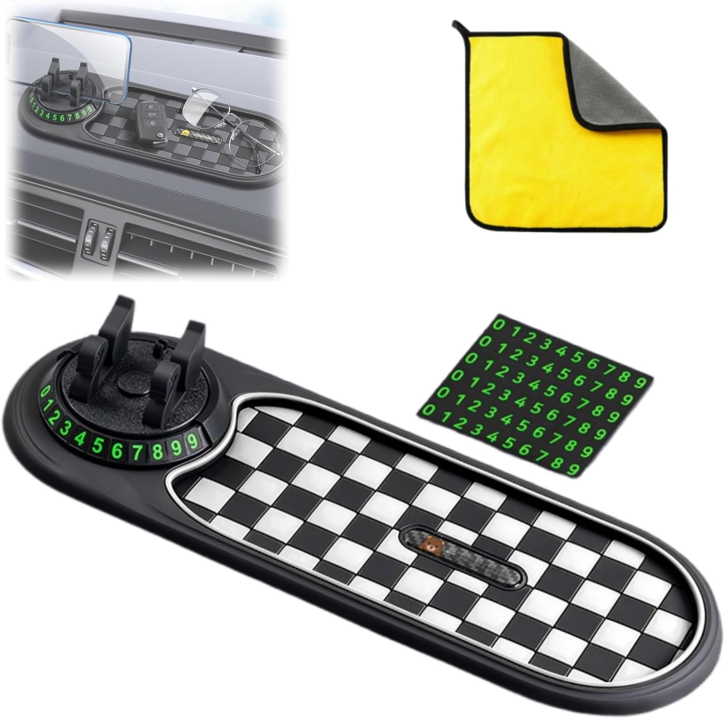 Multifunction Car Anti-Slip Mat Auto Universal Phone Holder, Rotatable Anti Skid Car Dashboard Pad with Temporary Parking Numbe, Anti Slip Phone Mat for Sunglasses, Keys (Black and White)